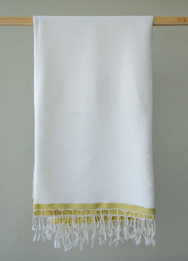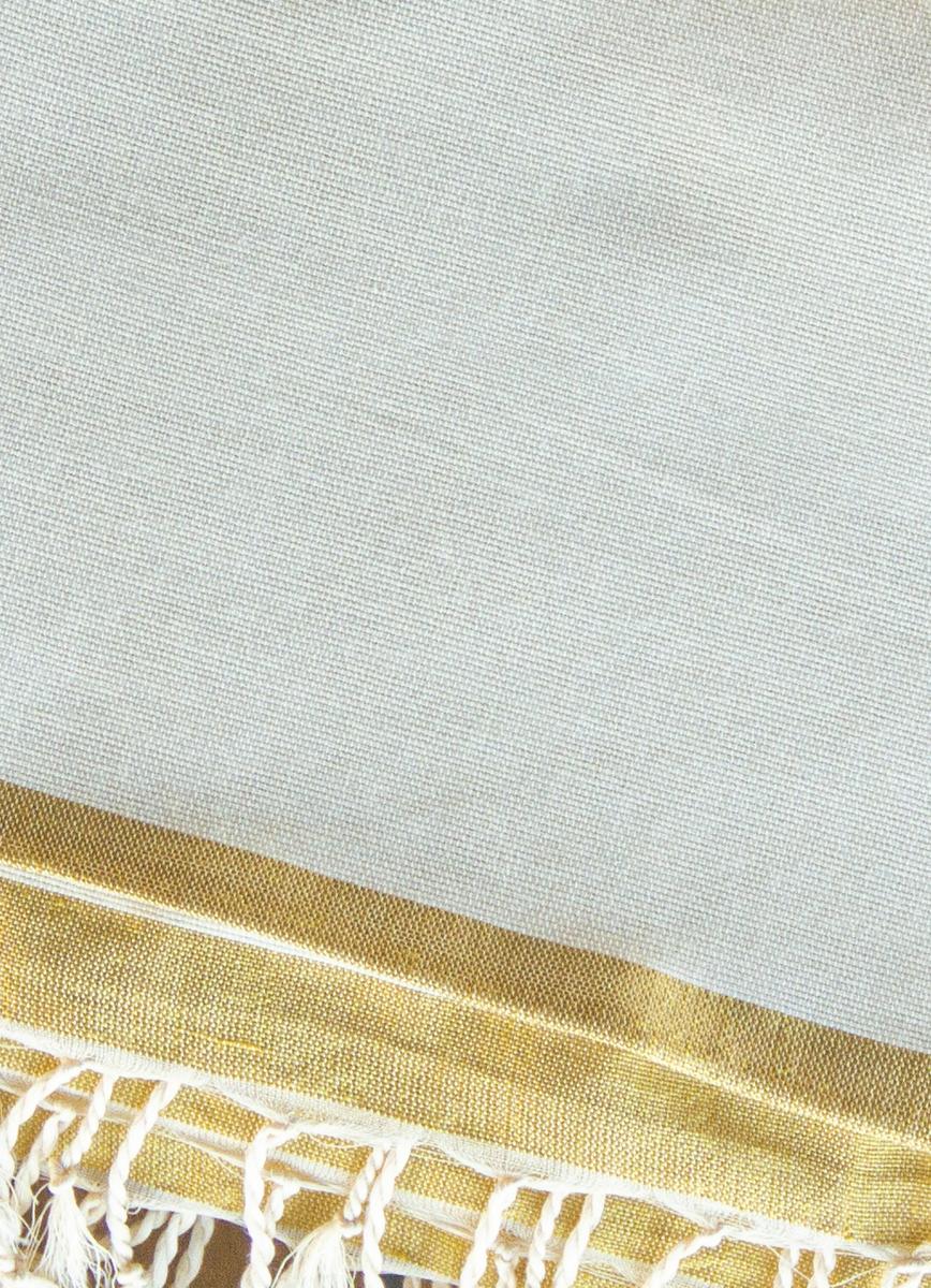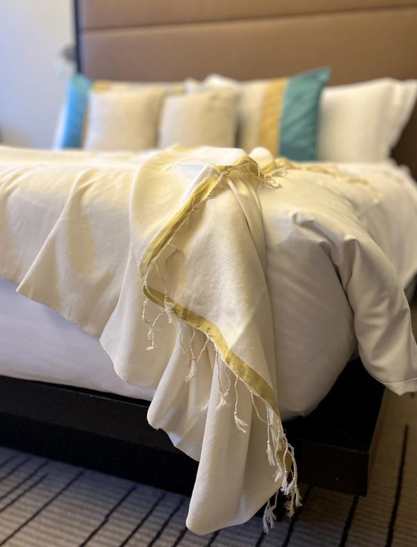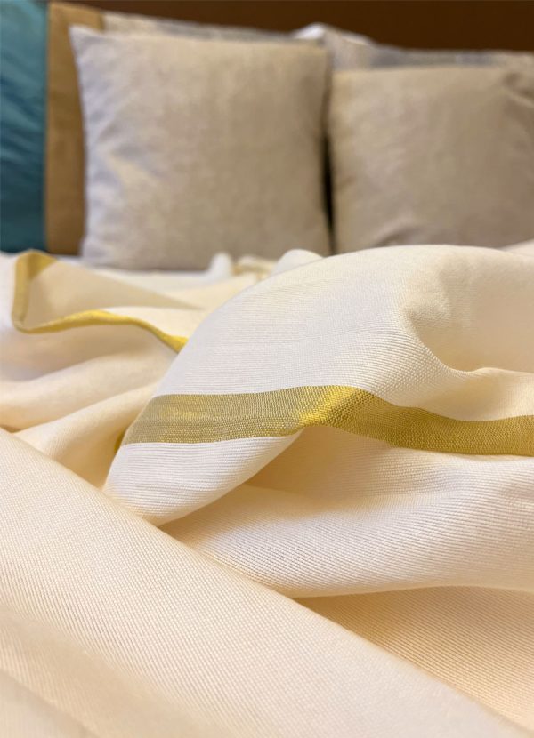 One-of-a-kind textile throw, a true piece of art, is crafted from a harmonious blend of linen and cotton, with a touch of opulence added by the beautiful gold silk detailing that graces both the edge and the middle of the throw. The shimmering gold silk creates a luxurious contrast against the natural white tone of the linen and cotton, elevating the throw to a statement of elegance and sophistication. Its versatile design makes it a striking addition whether draped over a sofa to accentuate its beauty or adorning a bed to bring a touch of glamour to your personal space.