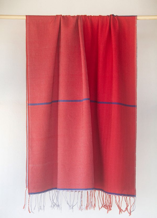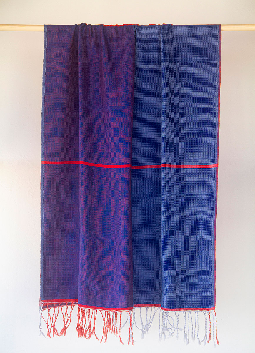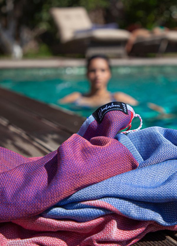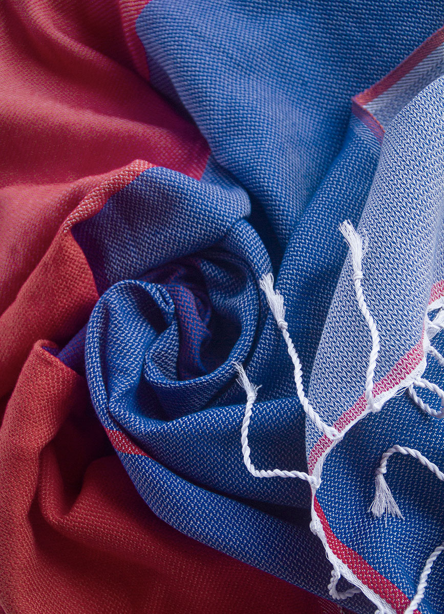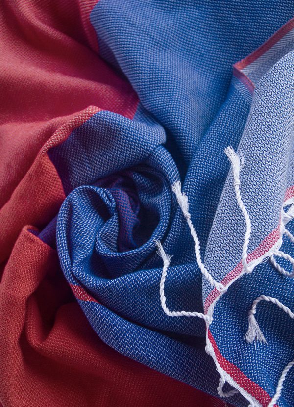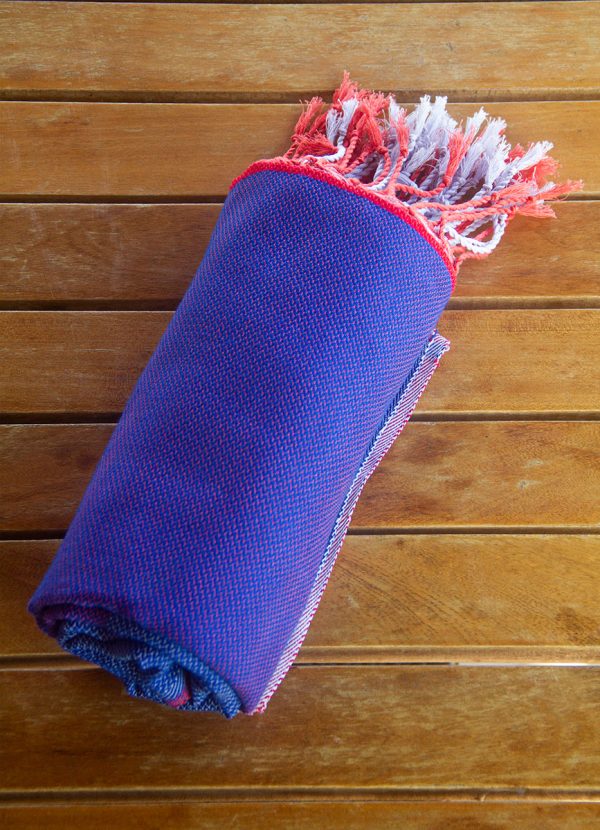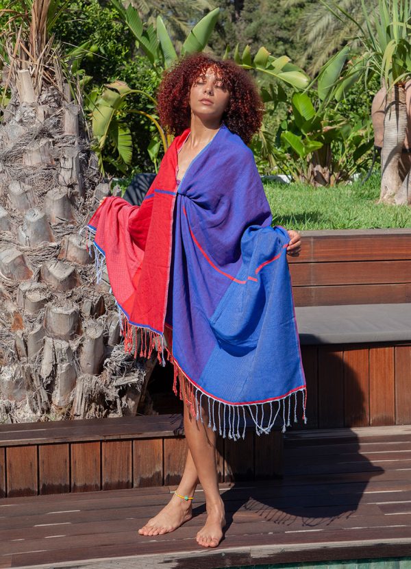 A cool mix of dark blue and bright red colors with a hint of purple. One-of-a-kind handwoven fouta towel, made with care and love for you. It has two sides, and each side has a stylish two-tone look for your beach essentials. It’s super soft and gets more comfortable with every wash. Plus, it’s versatile – perfect for the beach and for cozy moments at home, slung over the shoulders or hips.