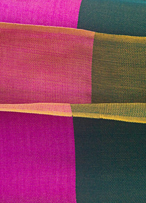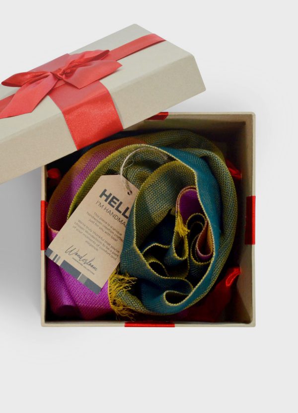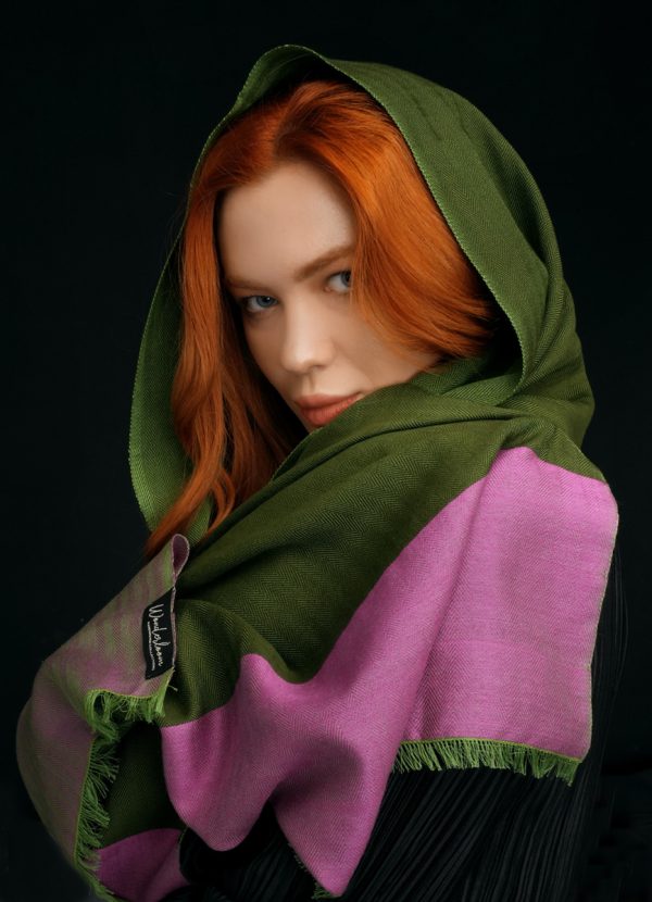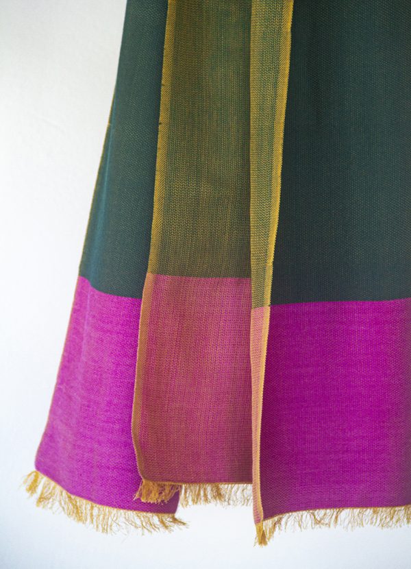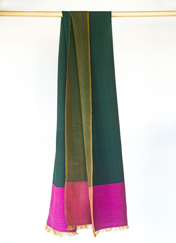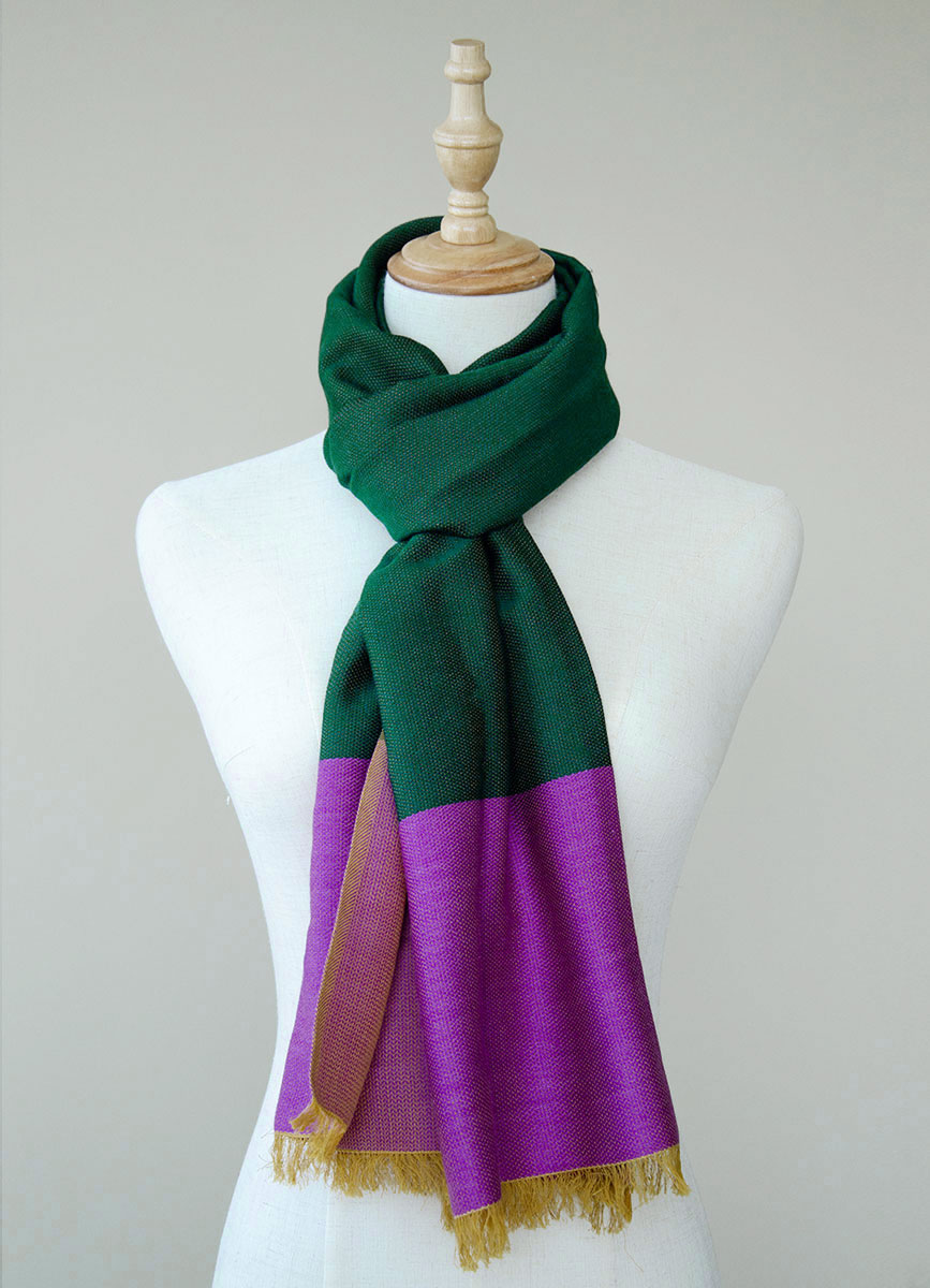 A stylish fusion of dark green and vibrant magenta. This one-of-a-kind hand-woven scarf made from a luxurious blend of wool, silk, and cotton. It will not only make a bold fashion statement but also provide cozy warmth, especially perfect for chilly nights. The unique combination of materials ensures a soft and comfortable feel against your skin, making it a versatile addition to your wardrobe.